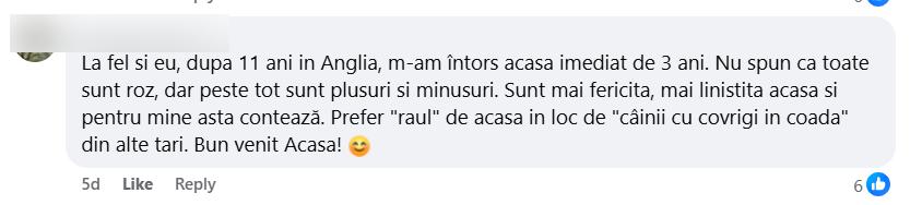 „La fel și eu, după 11 ani în Anglia m-am întors acasă de 3 ani. Nu spun ca toate sunt roz, dar peste tot sunt plusuri și minusuri. Sunt mai fericită, mai liniștită acasă și pentru mine asta contează. Prefer „răul” de acasă în loc de „câinii cu covrigi în coadă” din alte țări. Bun venit Acasă!”