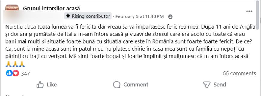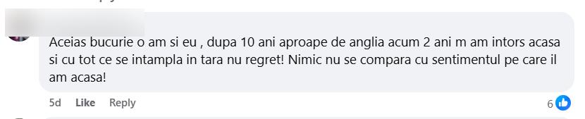 Românii care se întorc știu că România are defectele ei, dar balanța înclină acum spre liniște psihică. Mesajele de susținere și confirmările curg constant în comunitatea online: „Aceiași bucurie o am si eu. După aproape 10 ani în Anglia, acum 2 ani m-am întors acasă, și cu tot ce se întâmplă în țara nu regret! Nimic nu se compară cu sentimentul pe care îl am acasă!”, spune un alt utilizator.