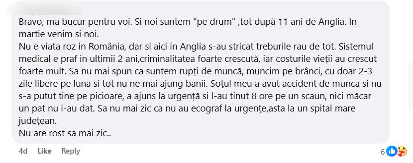 „Bravo, mă bucur pentru voi. Și noi suntem „pe drum”, tot după 11 ani de Anglia. În martie venim și noi. Nu e viața roz în România, dar și aici în Anglia s-au stricat treburile rău de tot. Sistemul medical e praf în ultimii 2 ani, criminalitatea foarte crescută, iar costurile vieții au crescut foarte mult. Să nu mai spun că suntem rupți de muncă, muncim pe brânci, cu doar 2-3 zile libere pe lună și tot nu ne mai ajung banii. Soțul meu a avut accident de muncă și nu s-a putut ține pe picioare, a ajuns la urgență și l-au ținut 8 ore pe un scaun, nici măcar un pat nu i-au dat. Să nu mai zic că nu au ecograf la urgențe, asta la un spital mare județean.”