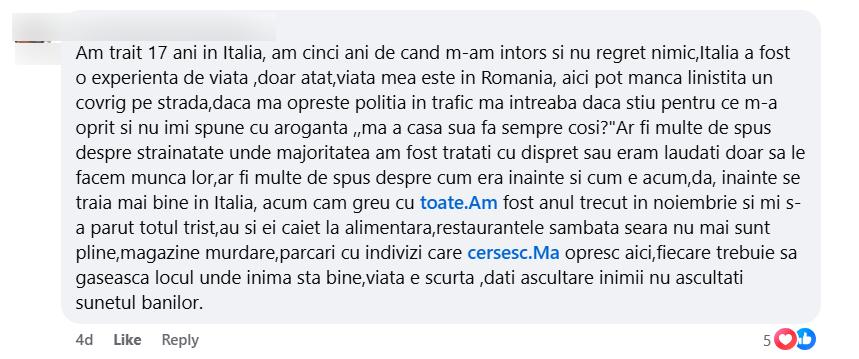 „Am trăit 17 ani în Italia, am cinci ani de când m-am întors și nu regret nimic. Italia a fost o experiență de viață, doar atât. Viața mea este în România, aici pot mânca liniștită un covrig pe stradă, dacă mă oprește poliția în trafic mă întreabă dacă știu pentru ce m-a oprit și nu îmi spune cu aroganță «ma a casa sua fa sempre così?» [la tine acasă tot așa faci?]. Ar fi multe de spus despre străinătate, unde majoritatea am fost tratați cu dispreț sau eram lăudați doar să le facem munca lor. Ar fi multe de spus despre cum era înainte și cum e acum. Da, înainte se trăia mai bine în Italia, acum e cam greu cu toate. Am fost anul trecut, în noiembrie, și mi s-a părut totul trist, au și ei caiet la alimentară, restaurantele sâmbătă seara nu mai sunt pline, magazine murdare, parcări cu indivizi care cerșesc. Mă opresc aici, fiecare trebuie să găsească locul unde inima stă bine, viața e scurtă, dați ascultare inimii, nu ascultați sunetul banilor.”