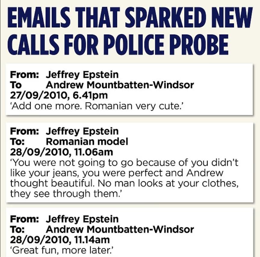 În alt email, referindu-se la evenimentele din acea seară, Epstein i-a scris lui Andrew: „Distracție plăcută, mai multe mai târziu”, la care Prințul de atunci a răspuns cu entuziasm: „Da, vă rog!”.