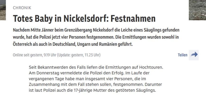 Pe 18 ianuarie, presa din Austria relata despre un caz greu de imaginat. Cadavrul unui bebeluș a fost găsit la punctul de trecere a frontierei Nickelsdorf. Polițiștii austrieci au arestat patru persoane în acest caz, ancheta fiind desfășurată în patru țări: Austria, Germania, Ungaria și România.