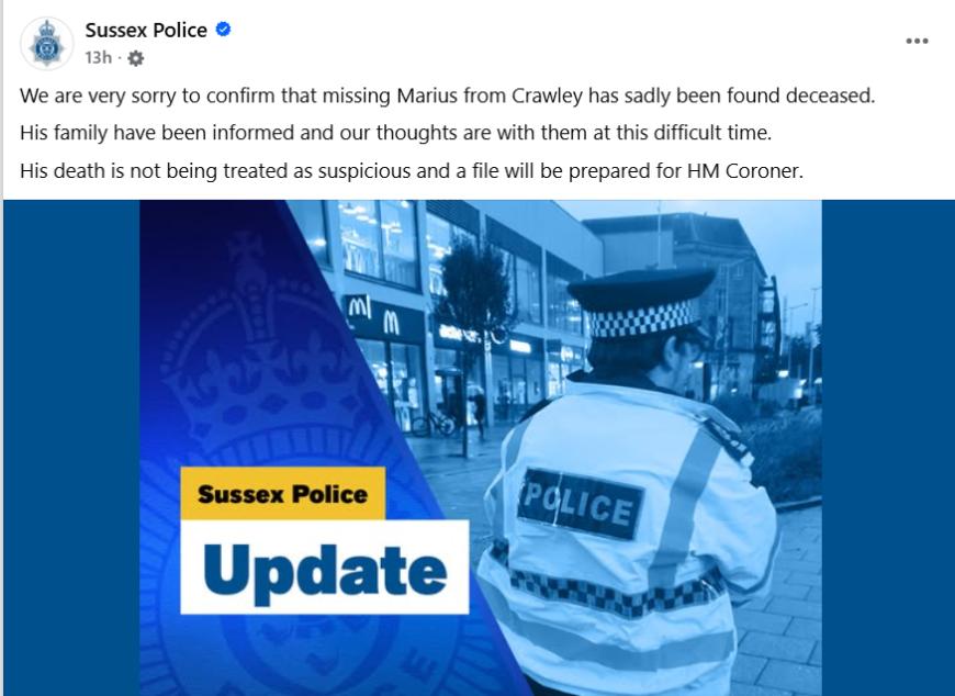 "Ne pare foarte rău să confirmăm că Marius, dispărut din Crawley, a fost găsit decedat. Familia sa a fost informată și gândurile noastre sunt alături de ei în aceste momente dificile. Moartea sa nu este tratată ca fiind suspectă și se va întocmi un dosar pentru medicul legist", se arată în mesajul poliției.